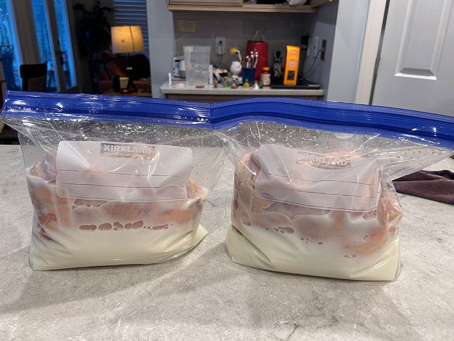 Then, add the raw bird to the bag with the salted buttermilk. Give things a good shake. Then, store it in the fridge and let time do its thing: ideally, you are letting it sit in the brine for at least 24 hours.