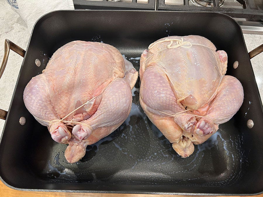 Once the chicken has rested, you need to truss it with cooking twine. Now, there are like a million YouTube videos on how to truss a chicken, but I honestly don’t think the method matters that much, nor do I think it needs to look particularly pretty: the main goal here is to just make sure the legs are tied together and that the bird’s various bits are as compact as possible. I’m sure my truss would make Martha Stewart clutch her pearls, but it does the job.