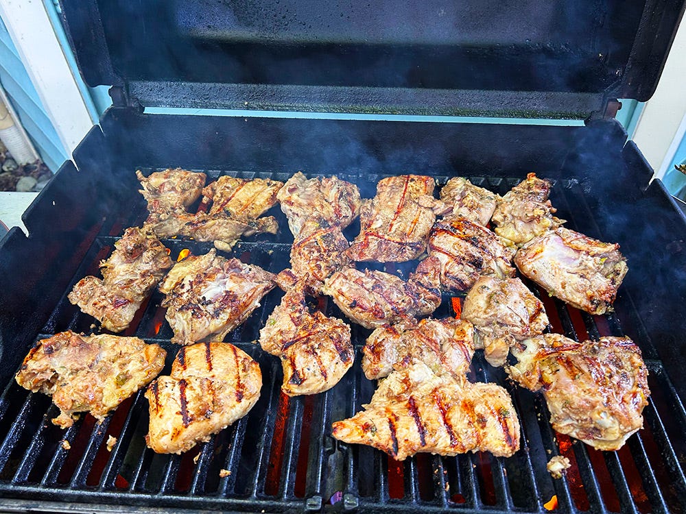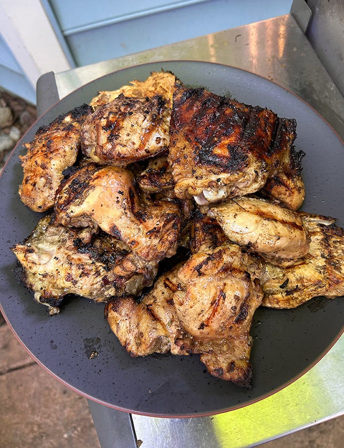 This recipe is based on something I stumbled across in Food & Wine years ago that takes a lot of the core seasoning components of a jerk rub (all spice, nutmeg, thyme, sugar, vinegar) but reduces the amount and kind of peppers (habanero and scotch bonnet are traded for a modest and easily available jalapeño). It also ups the tanginess by leaning into a citrus flavor profile. The result is something that hits the jerk craving but also won’t make you totally sweat: the perfect summer evening meal.