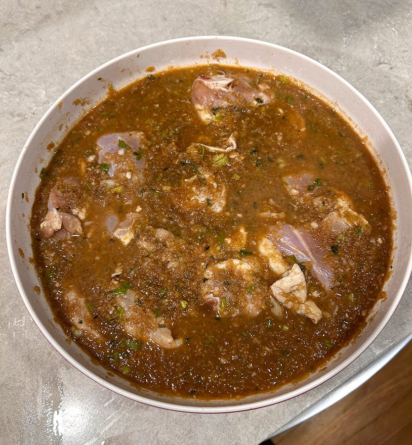 Next, rinse the salt from the chicken, pat dry, and add to the marinade. Cover and refrigerate overnight.