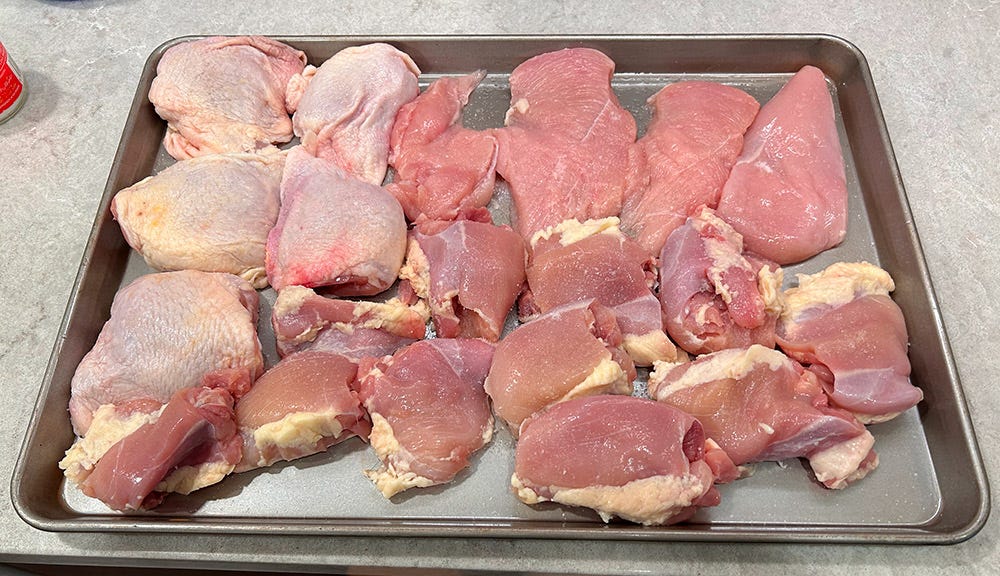Okay, so the first step here is simple but very important: you are going to want to spread the chicken on a single layer on a sheet pan. And, then, you are going to want to salt the living hell out of it….like a Scarface level coating of salt. Once that’s done, let the chicken sit while you make the marinade.